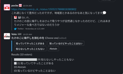 たけのこの皮に梅干しをはさんで吸うやつが全然通じなかったのだけど、これはあまりメジャーな食べ方ではないのだろうか— 🎹 (@p_ck_) March 19, 2022 twitter.com ruby-jpでのアンケート 知り合いに「小さい頃たけのこの皮に梅干しを入れて吸っていたのを思い…